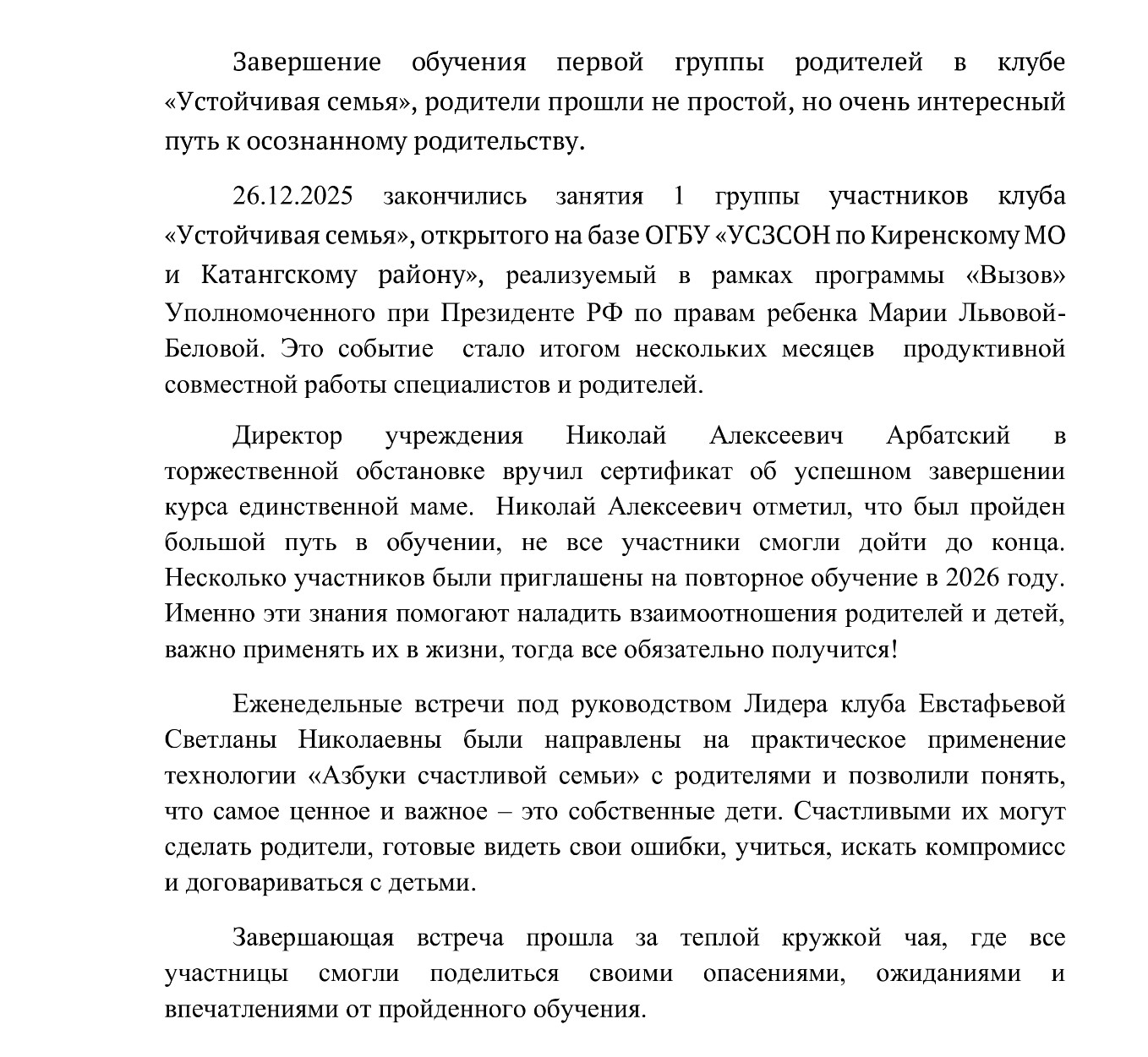 Завершение обучения первой группы родителей в клубе «Устойчивая семья» - УСЗСОН Киренск-Катанга ОФИЦИАЛЬНЫЙ САЙТ